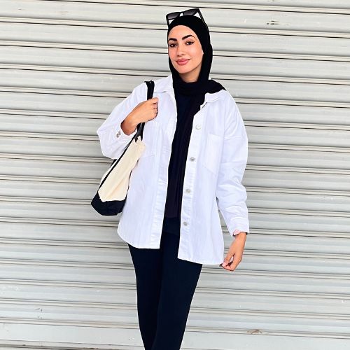 Veste en jean à col à revers et manches longues terminées par un poignet boutonné. Détail de poches plaquées sur le devant. Fermeture avant par boutons métalliques.